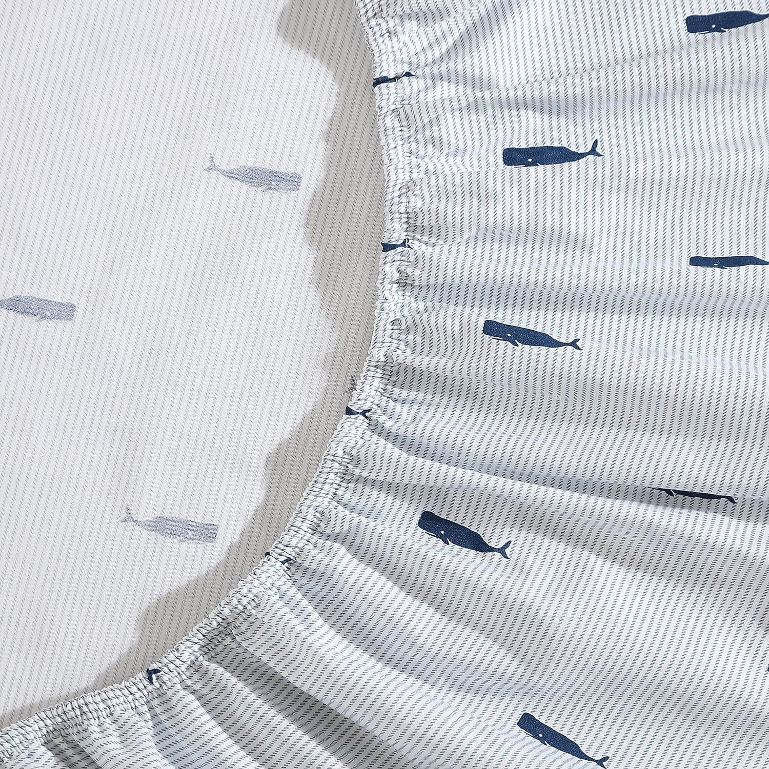 اللون والإحساس: هذه المجموعة الأساسية لغرفة النوم ناعمة ومريحة، وستضفي لمسة من الأناقة واللون على ديكورك. ورقة مفردة - خفيفة الوزن ولكن متينة؛ الخيوط منسوجة بإحكام لضمان نعومتها على جميع الأطقم. مجموعة شراشف نوتيكا تتميز بنمط حوت أزرق داكن مع خطوط تشامبري على خلفية بيضاء صلبة.